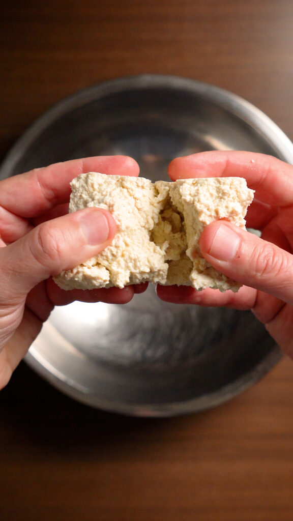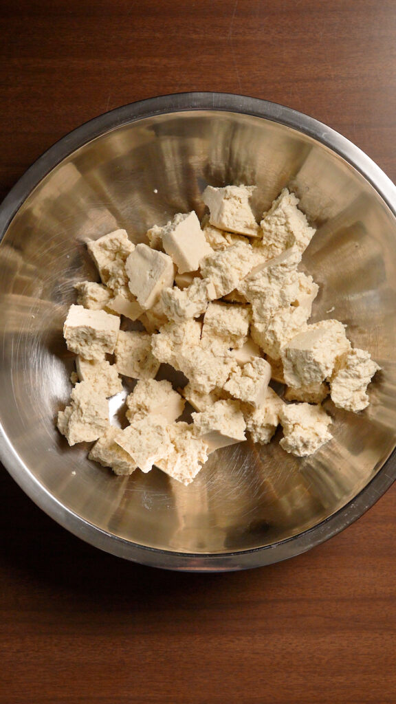 Pat the tofu dry, and then break it into bite sized chunks. This will give us more nooks and crannies for the marinade to stick to.
