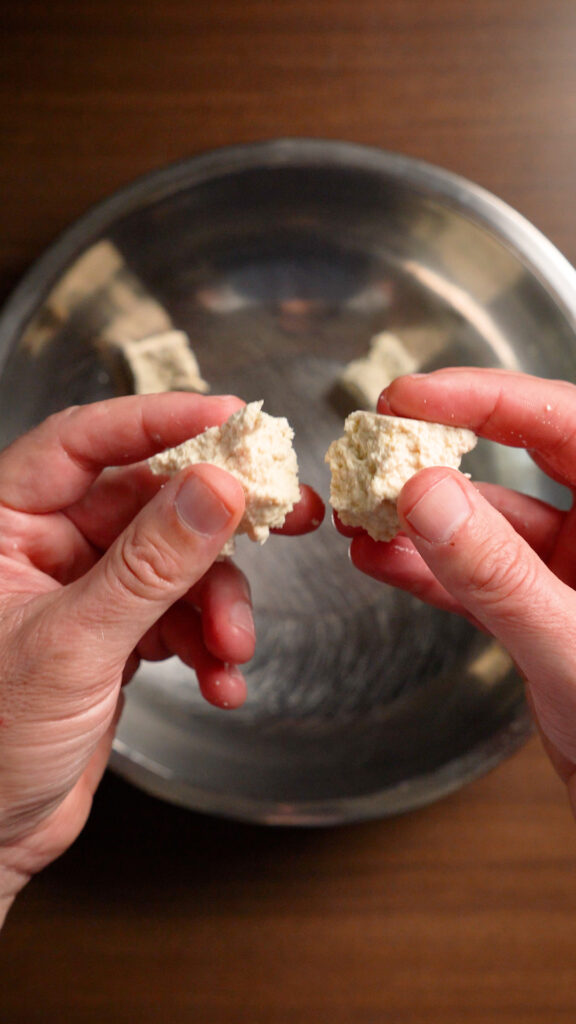 - Take the tofu out of it’s packaging and pat it dry with a paper towel. Break the tofu into bite sized chunks. I find it’s easiest to break the whole block in half, and then keep breaking each section in half until they are about bite size.