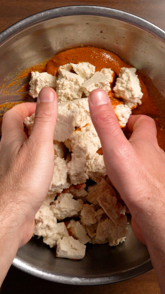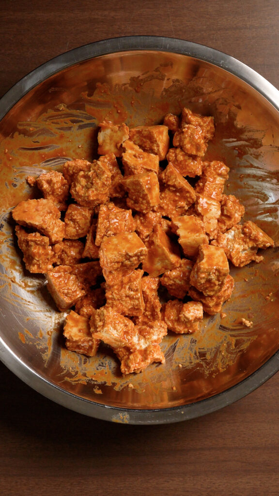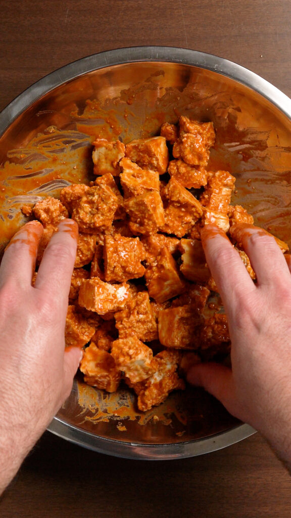 Gently toss the tofu chunks in the marinade. Taste one chunk and adjust seasoning as needed.
