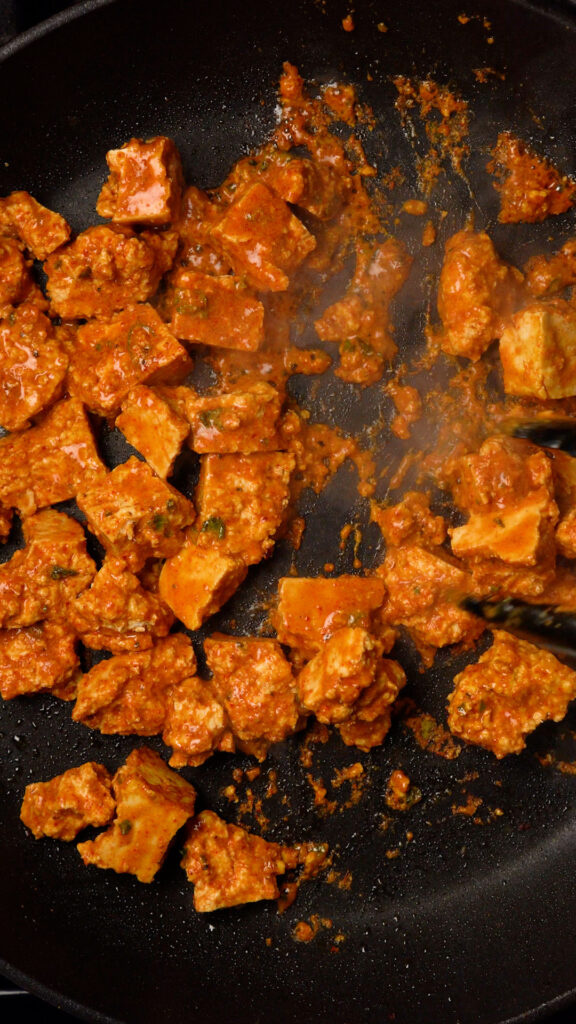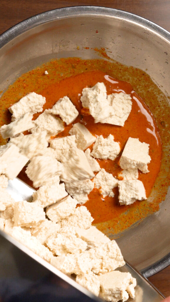 - If gravy feels too thick, add water until you get your desired consistency. Taste and adjust for seasoning, adding any salt, spices or even more lemon juice if needed. Then add the reserved tofu back in. Stir to coat the tofu and then serve immediately over rice or with some naan / flatbread. Garnish with chopped cilantro!
