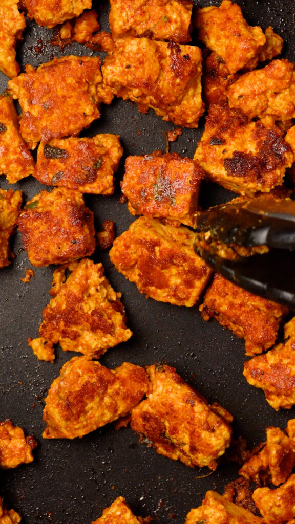 Heat up a 12″ skillet over medium heat, pre-heat for 3 – 4 minutes. Then add in the tofu chunks and cook for 2 – 3 minutes per side. Don’t crowd the pan. You may need to do this in batches. Once they are looking good, remove from the pan and reserve for later.