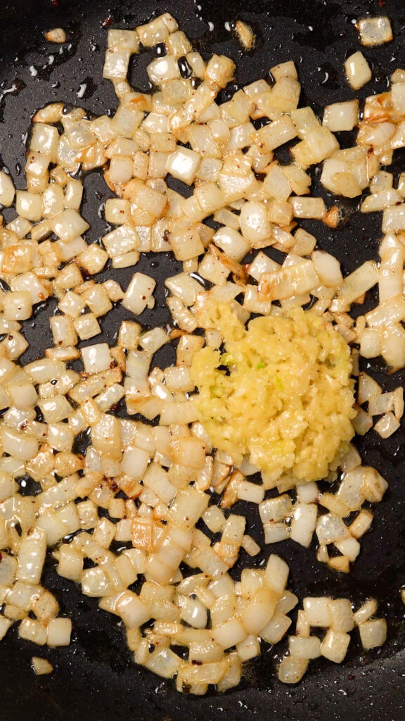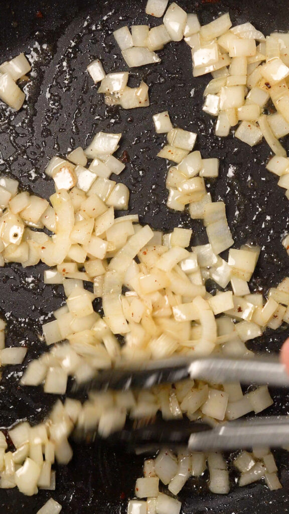 Add 2 Tbsp of the Vegan Butter to the pan and melt. Add in the diced onion and cook over medium heat for 8 – 10 minutes or until softened and translucent.