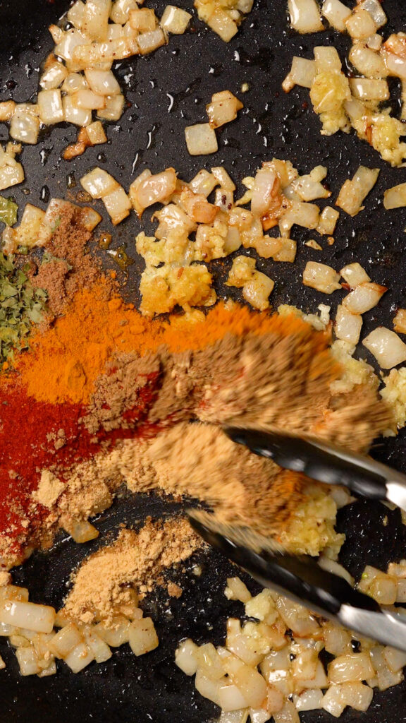 - Add in the Minced Garlic, Kashmiri Chili, Ground or Fresh Ginger, Turmeric, Garam Masala, Ground Coriander, Cumin, and Fenugreek. Stir to coat and cook the garlic / spices for 1 minute.
