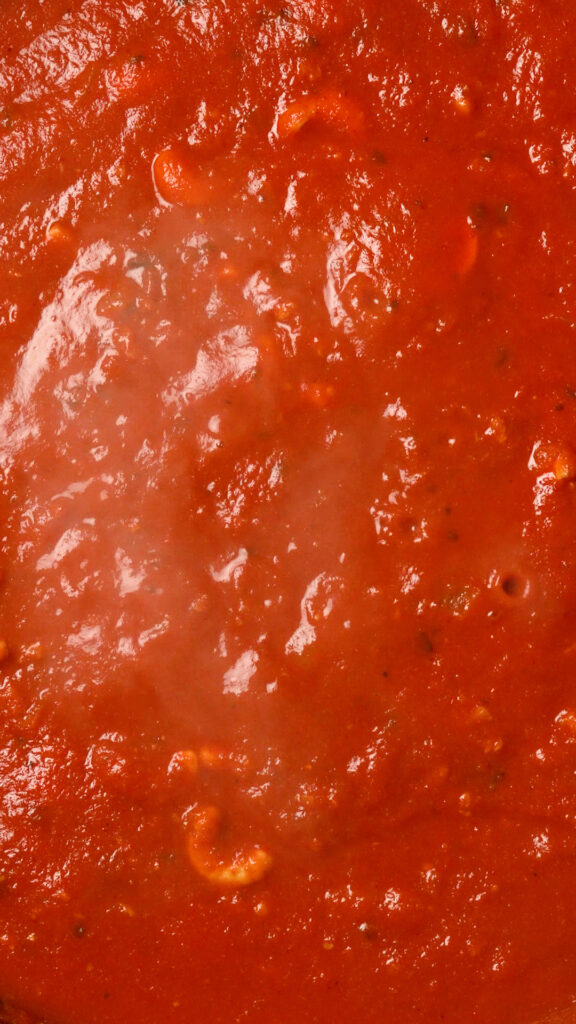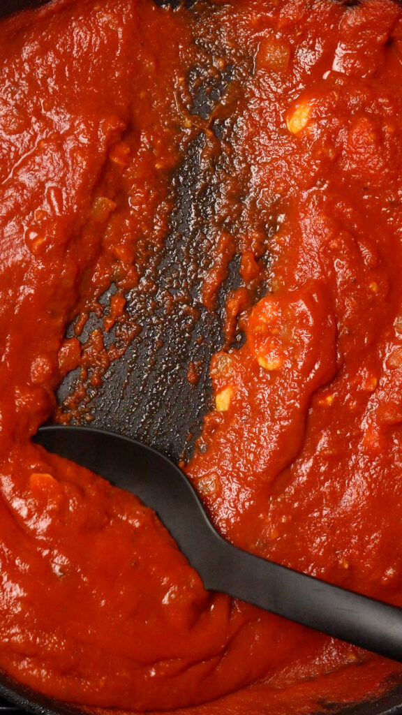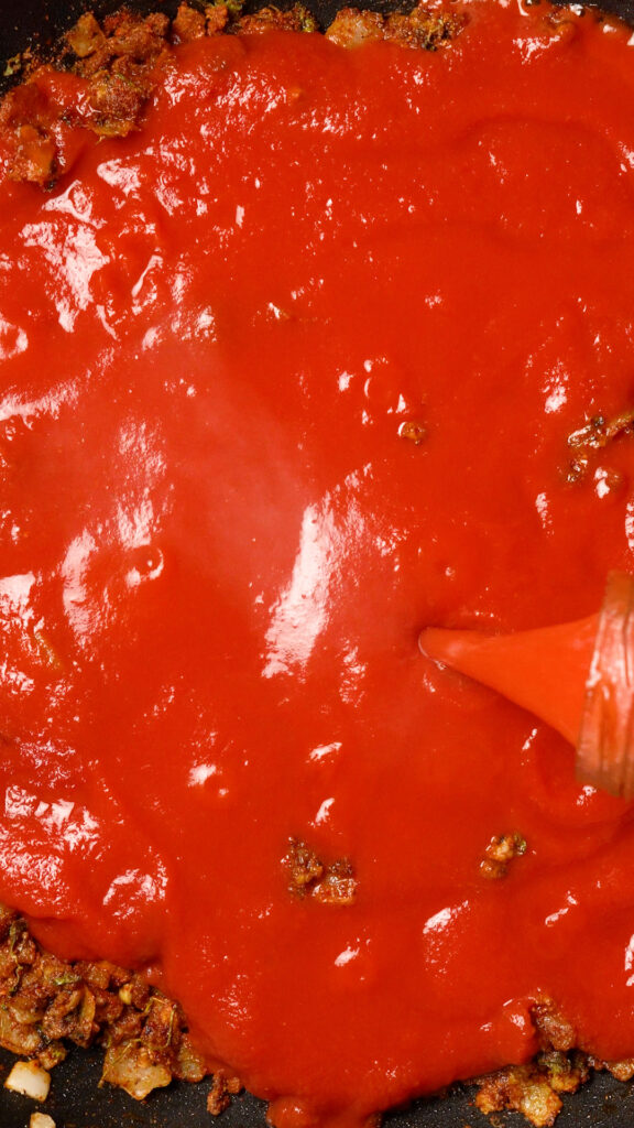 Add in the Minced Garlic and spices. Stir to coat and cook the garlic / spices for 1 minute then add in the Tomato Sauce / Passata