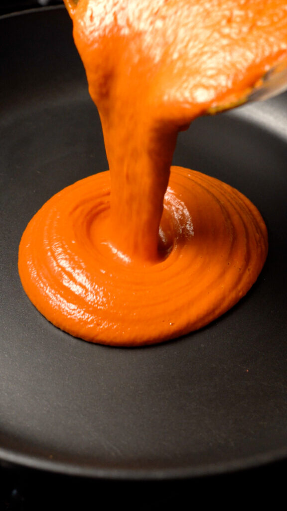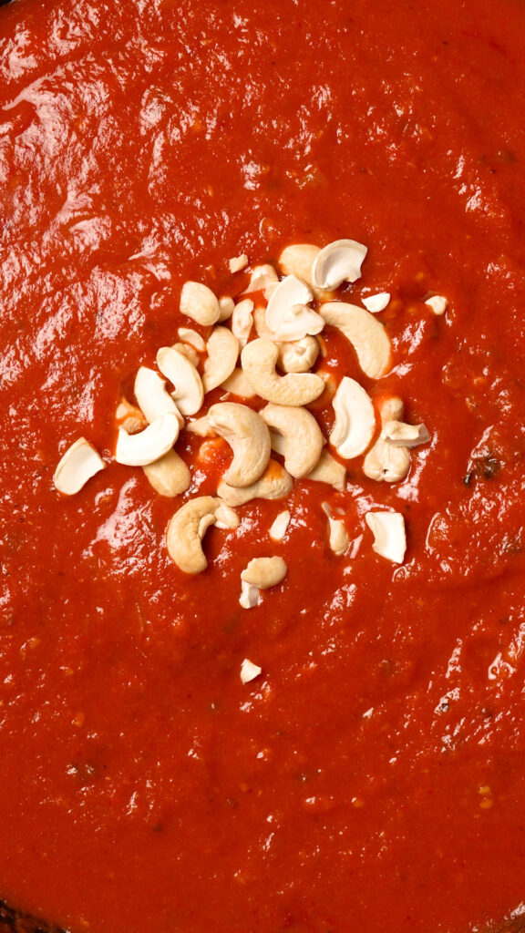 - Add in the Tomato Sauce / Passata. Add about 1/4 cup water to the can or jar and rinse to loosen the leftover tomato sauce. Add to the pan and stir to combine. If it feels a bit thick, add 1/4 cup of water at a time until it's at desired consistency. Add the cashews and bring to a simmer for about 10 minutes.