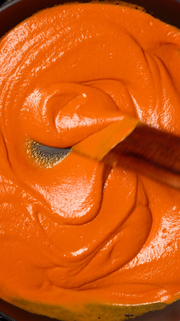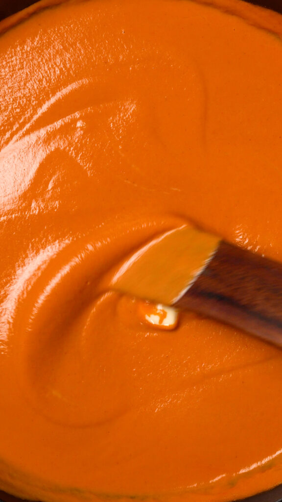 I highly recommend blending the mixture with an immersion blender, or carefully remove it from the pan and blend in a high speed blender. Then return to the pan, along with the plant milk and 2 Tbsp of Vegan Butter. Stir to melt and incorporate.