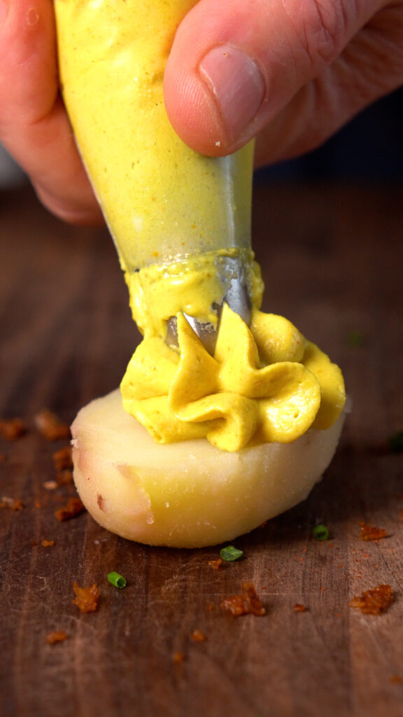 This recipe will make about a 20 – 24 Deviled Potatoes. They are best the fresher they are, but you can store them in the fridge for 1 – 2 days and they’ll still be good, just not as crunchy!
