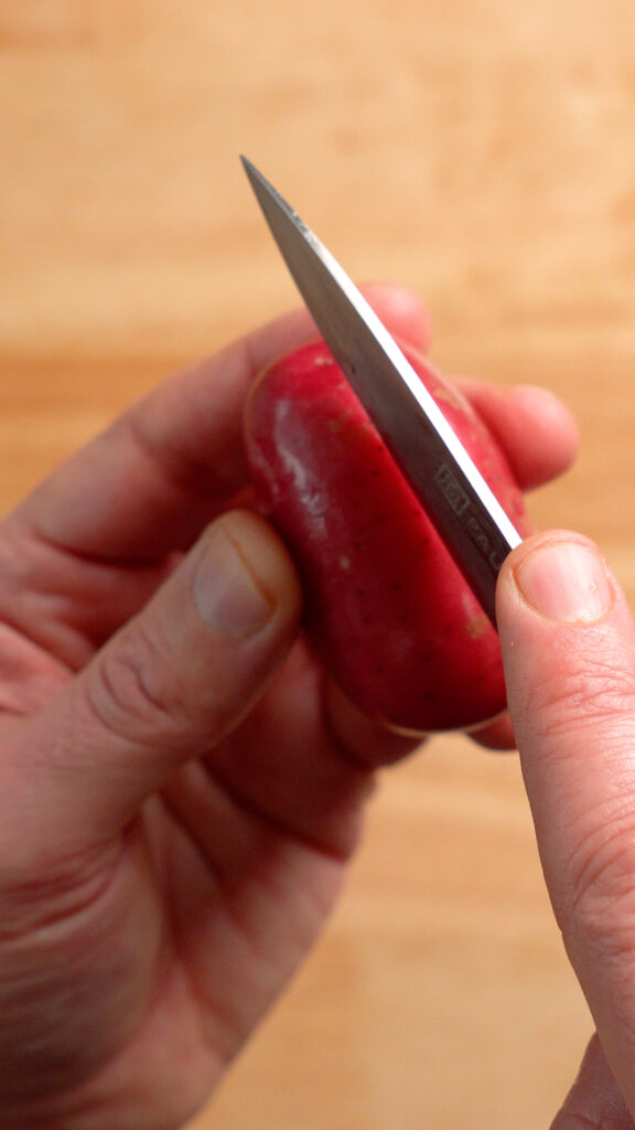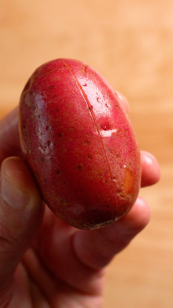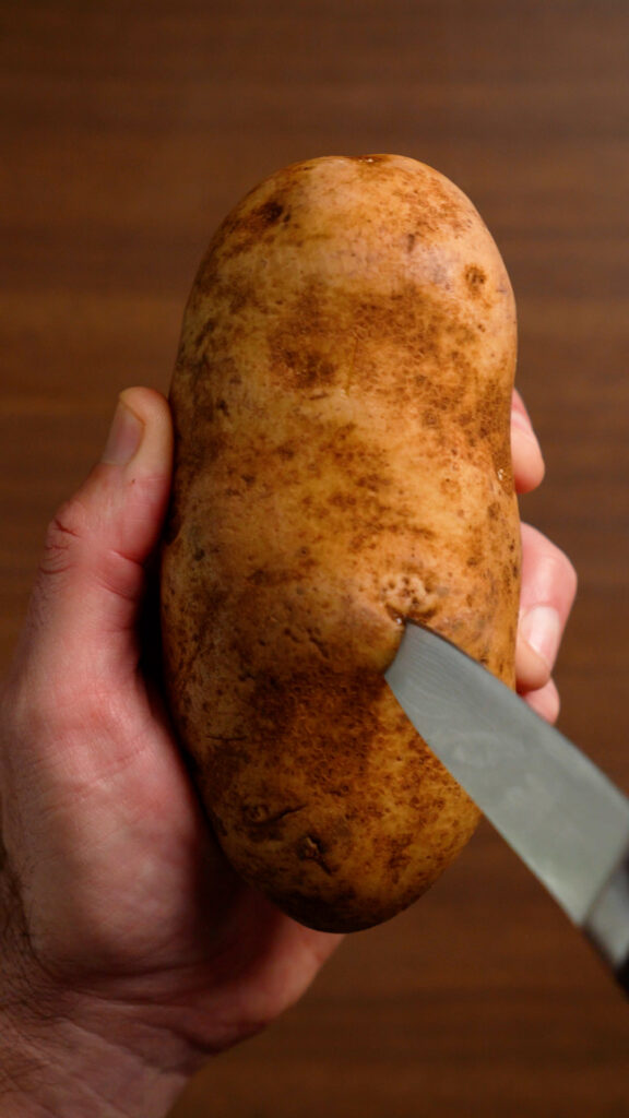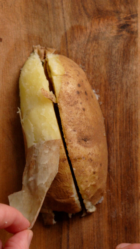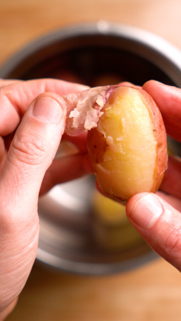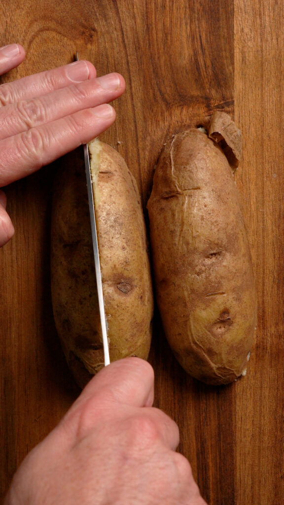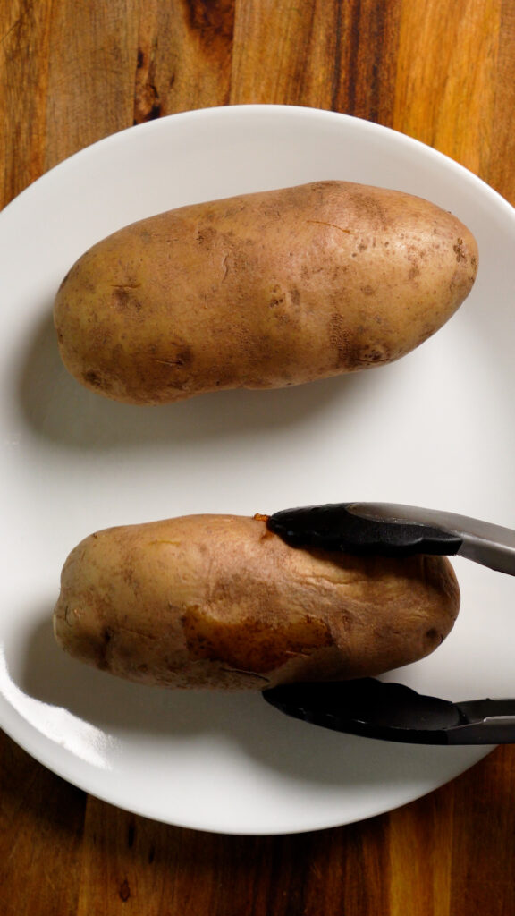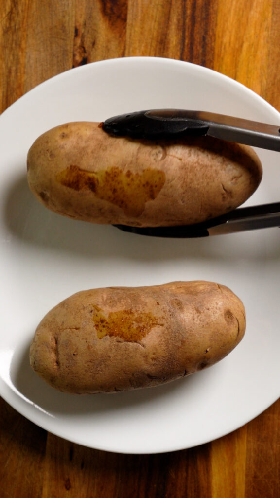 Cook the potatoes until fork tender. I like to use a thermometer and get them to an internal temp of 200 F / 93 C. These days I microwave them on high for about 8 – 10 minutes, flipping halfway through. But feel free to boil them or whatever method you like.