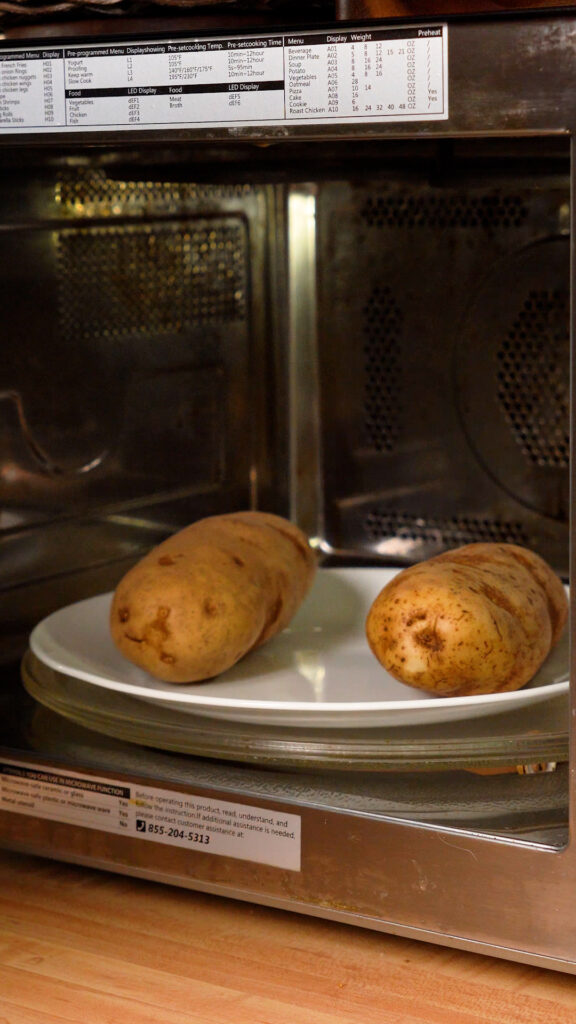 - Cook the potatoes until fork tender. I like to use a thermometer and get them to an internal temp of 200 F / 93 C. These days I microwave them on high for about 8 – 10 minutes, flipping halfway through. But feel free to boil them or whatever method you like.