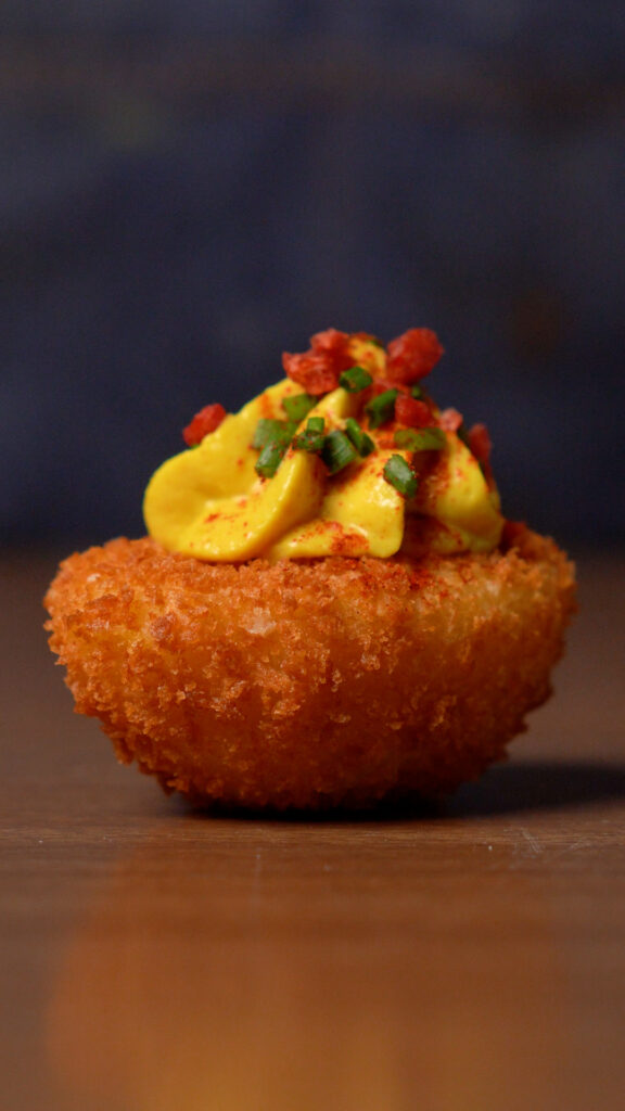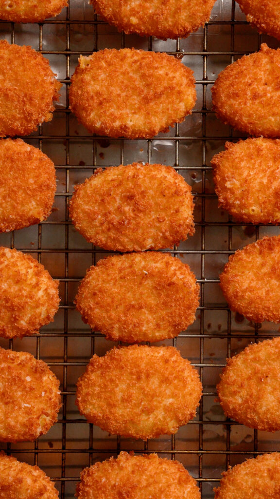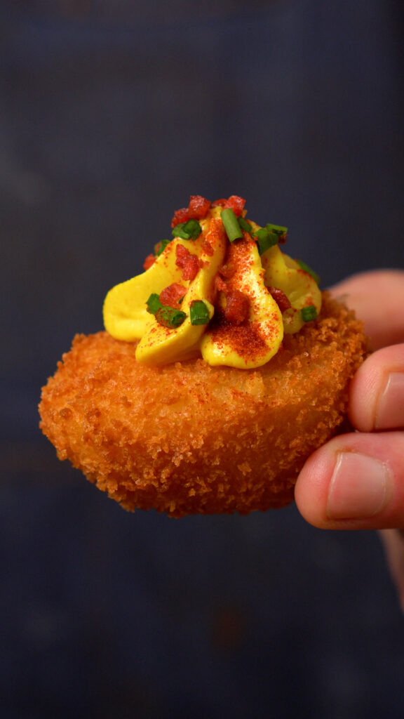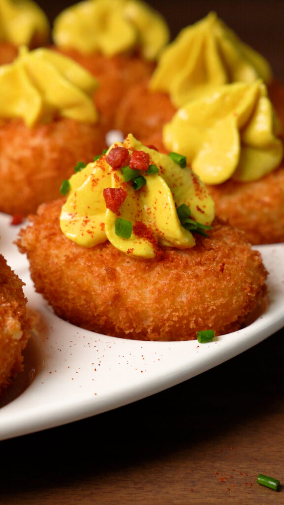 And while these might be a bit of work, not only are they totally worth it, but you can make the filling and mashed potato “eggs” the day before. Then you just gotta batter and fry them and they are good to go! Perfect for a potluck or party!