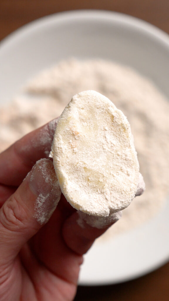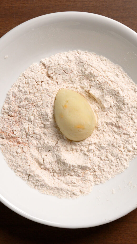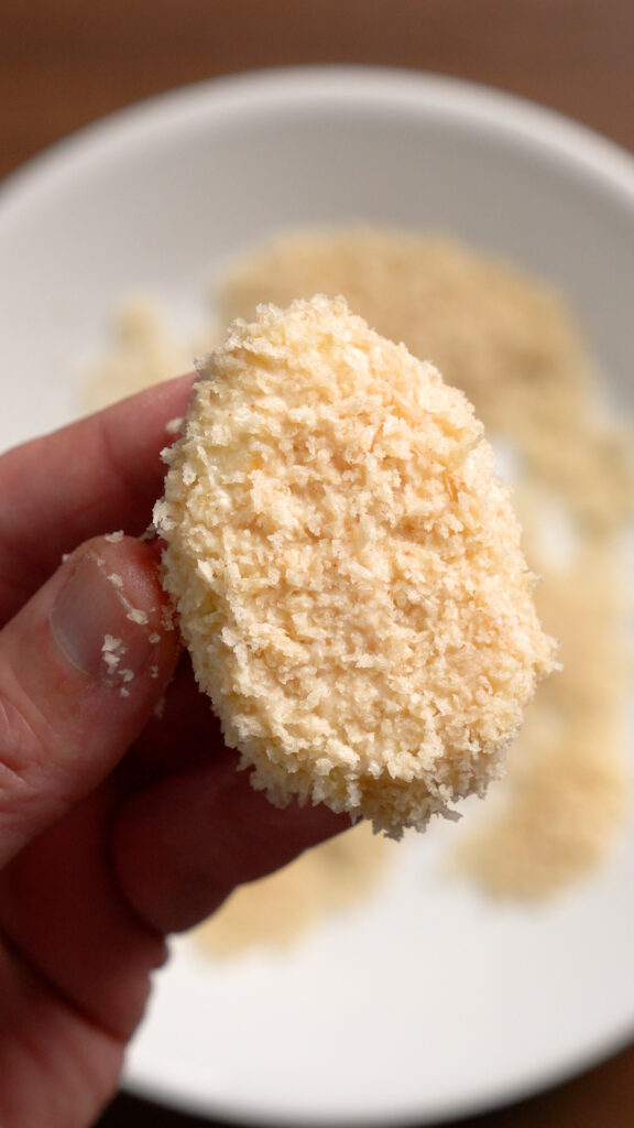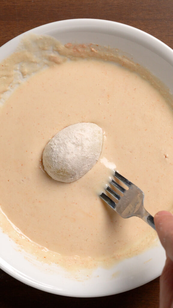 - While oil heats up, coat each potato “egg” in the flour, then buttermilk, and lastly the panko. Cover thoroughly, but let the excess drip or shake off too.