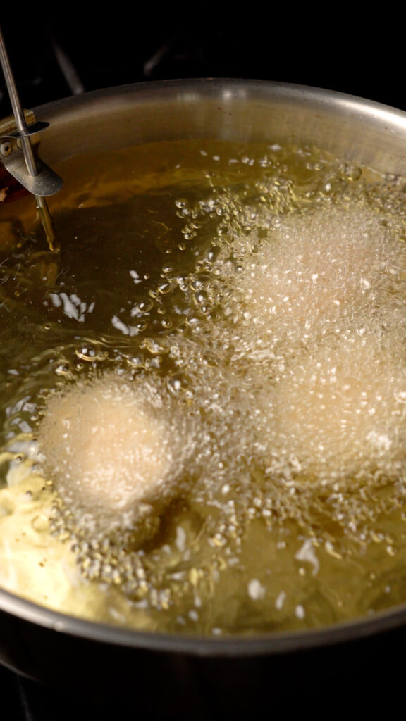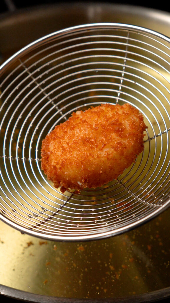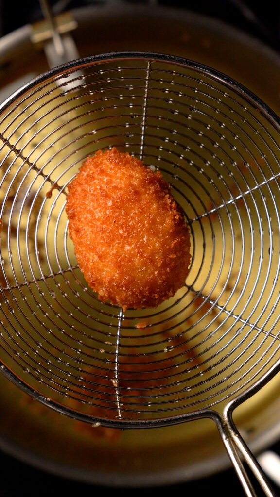 - Once oil is up to 375 F / 190 C, carefully add 4 – 5 of the potato eggs, making sure not to crowd the pan. Fry until golden brown (about 3 – 4 minutes), then remove with a slotted spoon and let them rest on a wire rack lined baking sheet.