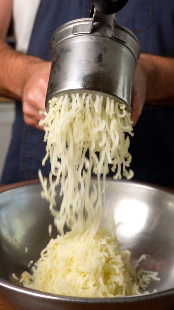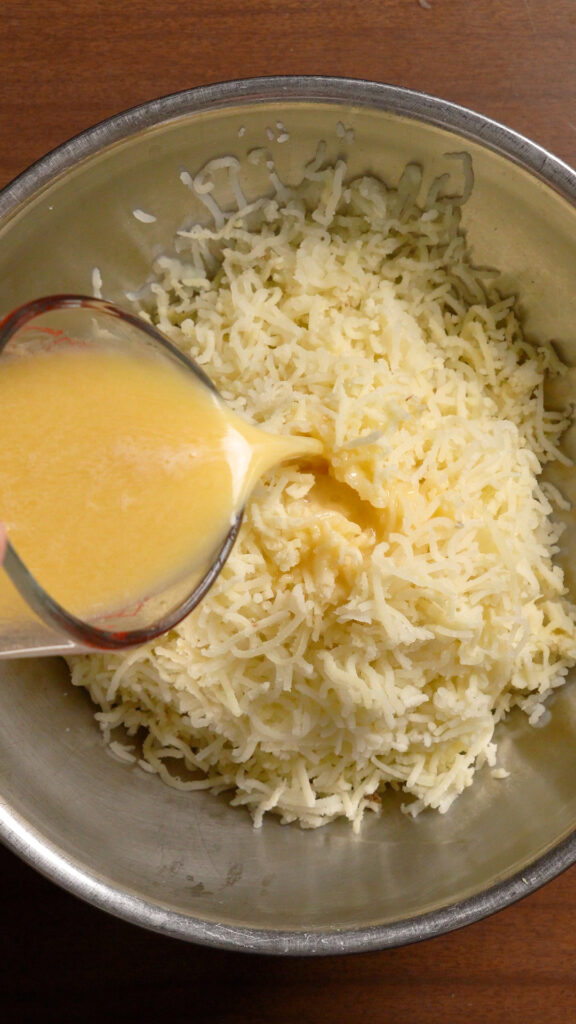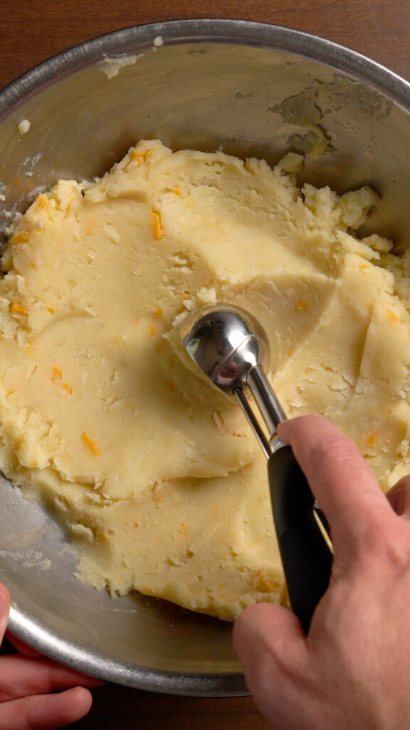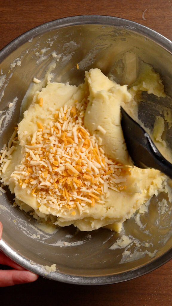 Mash the potatoes in a bowl with a potato masher, or a potato ricer. Pour over the milk and butter mixture, season with salt, garlic powder and nutritional yeast. Optionally, fold in about 1/2 cup of your favorite shredded vegan cheese. The mixture should be on the dryer side, this will help it keep it’s shape and not get too mushy.