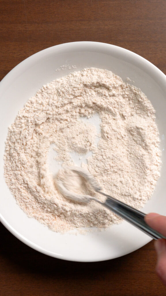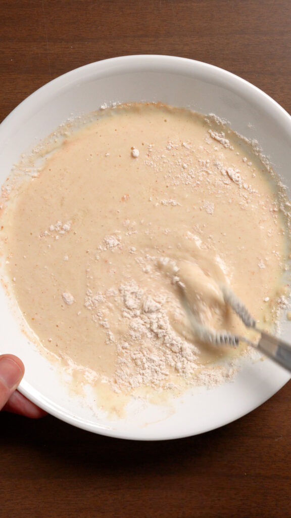 - Into 3 separate bowls, prepare the dredging stations: seasoned flour, vegan buttermilk, panko breadcrumbs.