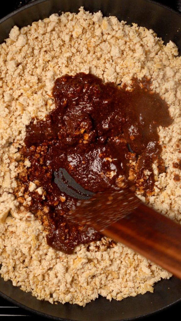 Add in the dijon mustard and vegan sour cream, and then the reserved ground tofu beef.