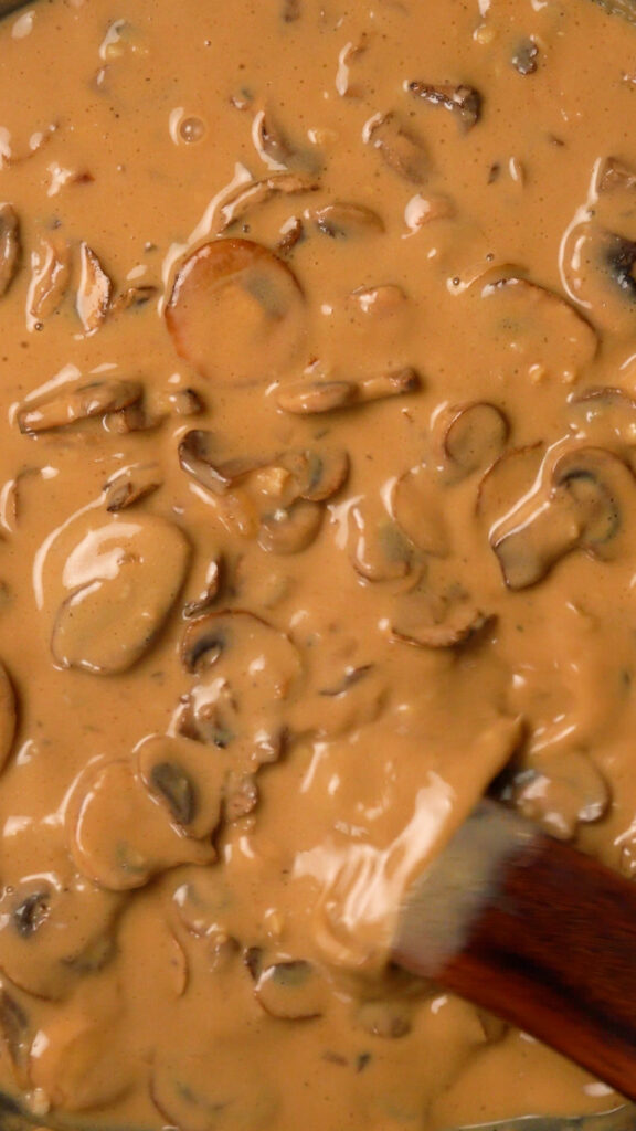 - Add in the dijon mustard, vegan worcestershire, nutritional yeast, and sour cream and stir to combine. Taste for seasoning and simmer until the sauce is thickened to your liking. Add in more veggie broth if it's too thick.