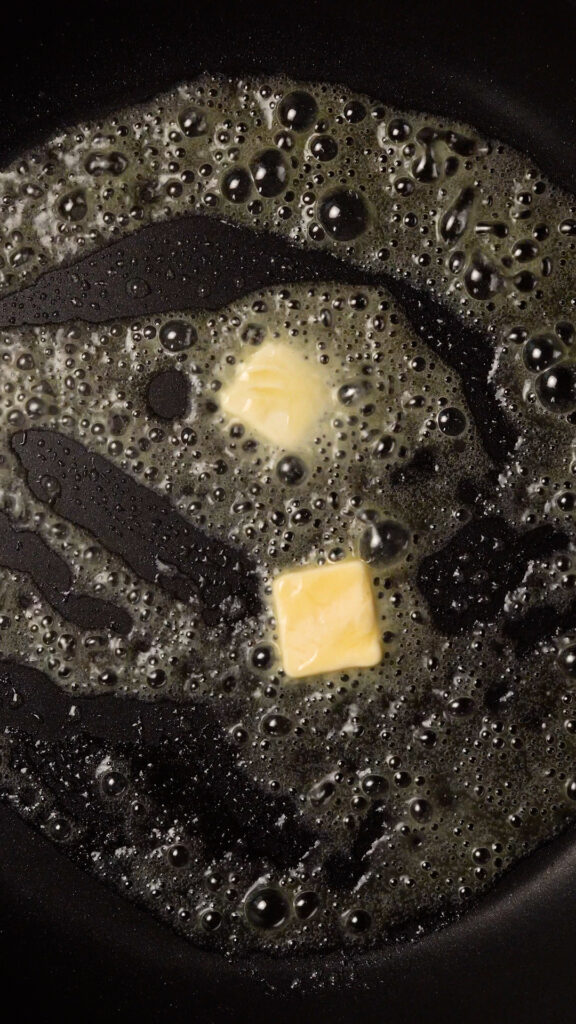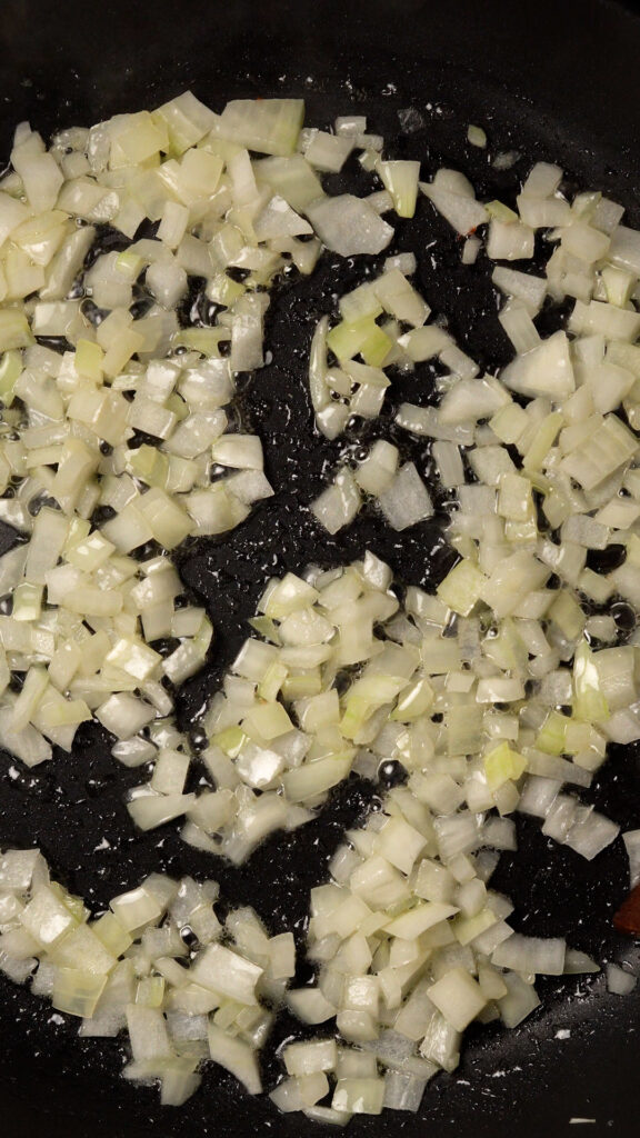 - Melt 2 Tbsp of the vegan butter and then add in the diced onions / shallots. Cook for 4 – 5 minutes or until slightly translucent and softened.