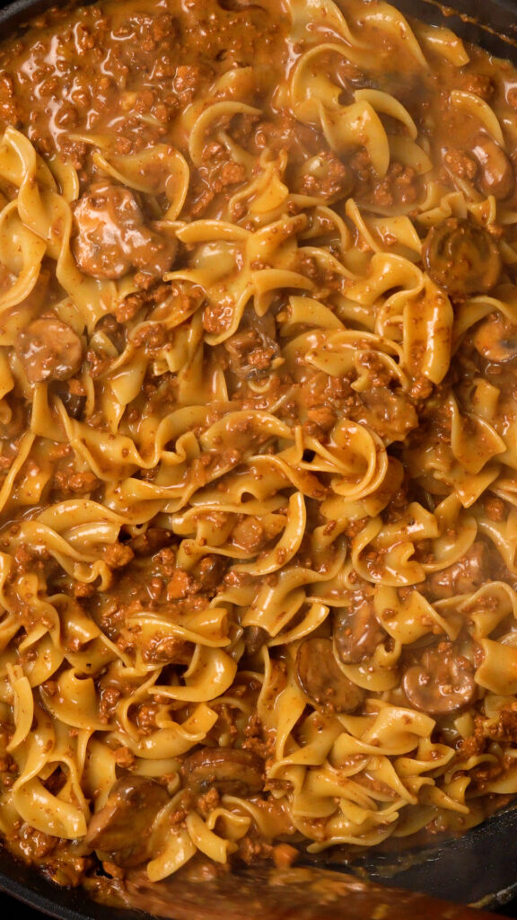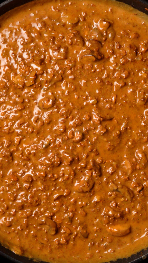 - Toss the reserved tofu ground beef back into the gravy and stir to combine. Add in more veggie broth if needed and serve immediately over mashed potatoes or pasta.