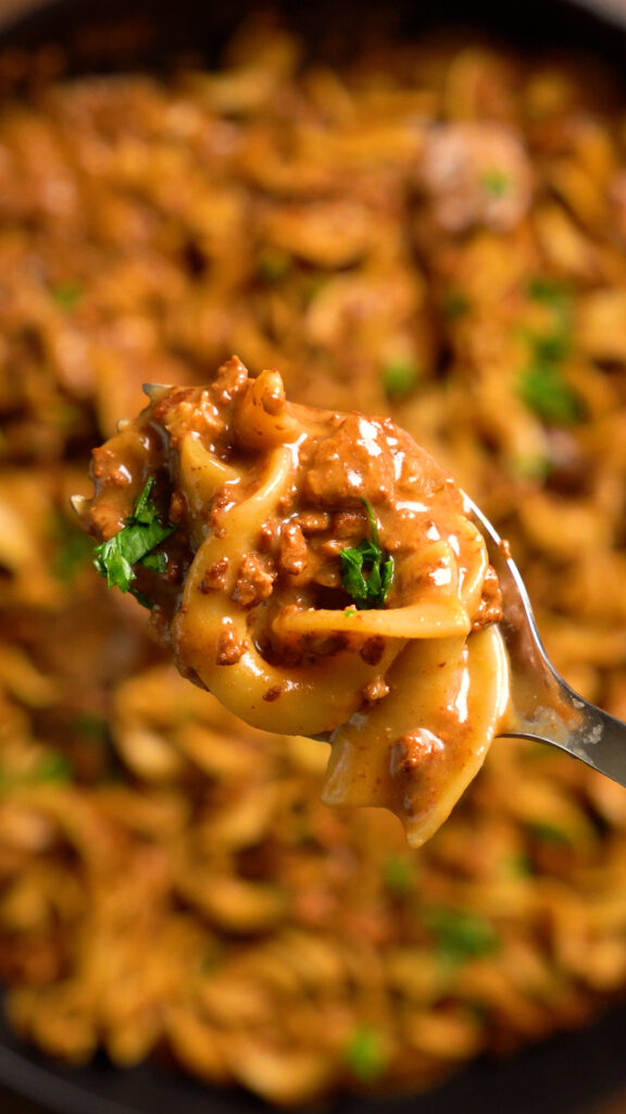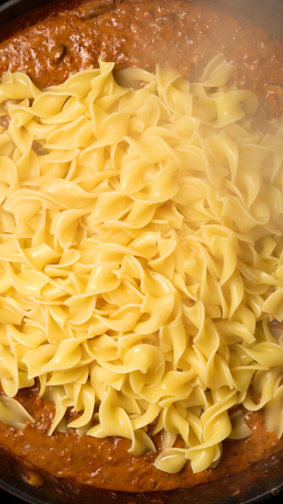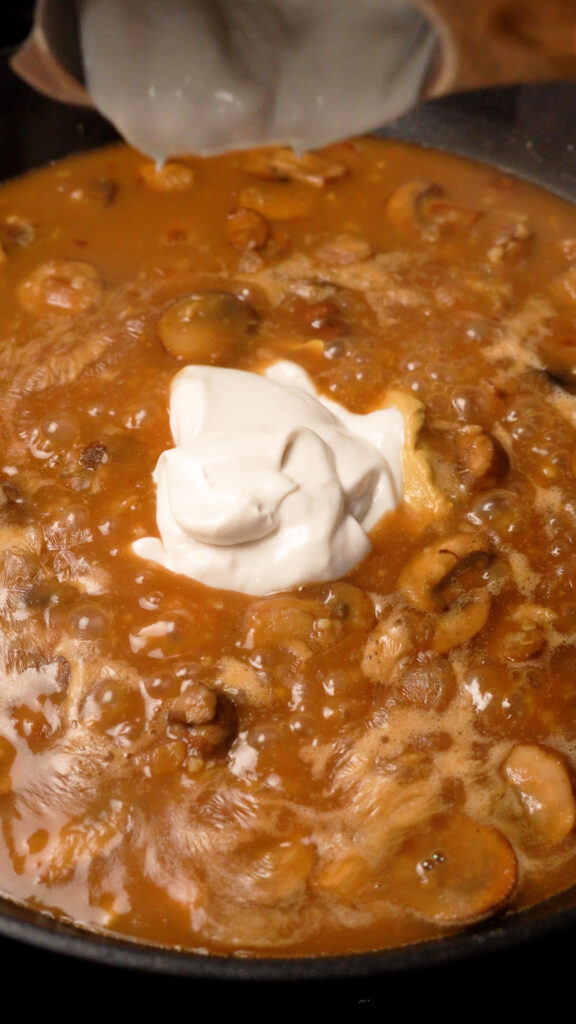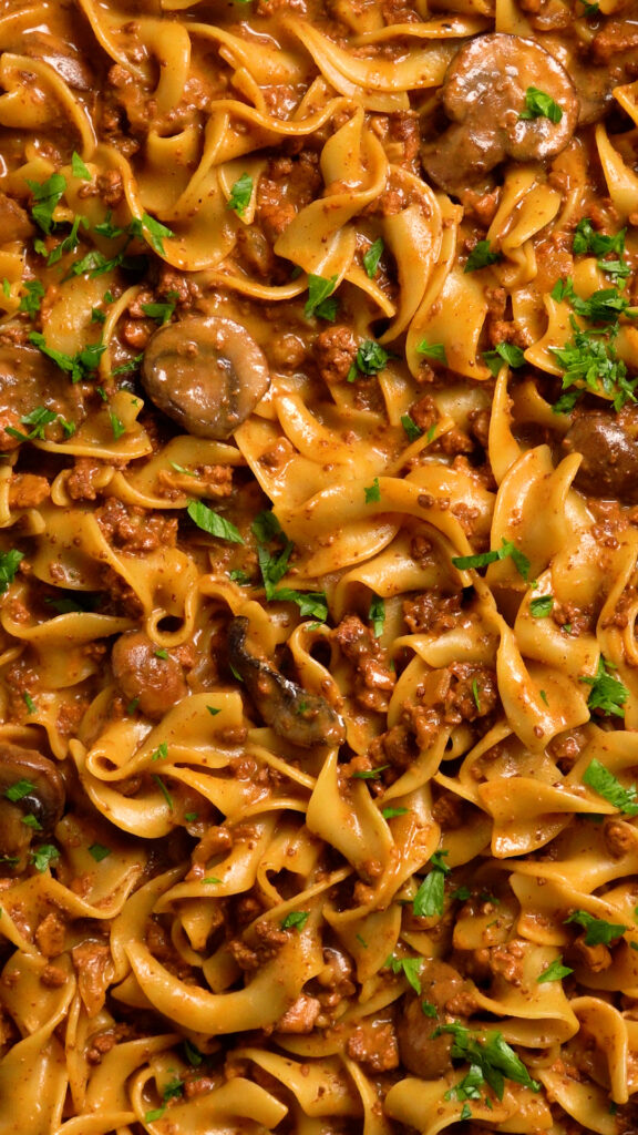 Beef Stroganoff typically uses onions, mushrooms and garlic too. They all work wonderfully together in this dish so don’t skip ’em! Feel free to add some chopped fresh parsley or chives at the end of cooking too.