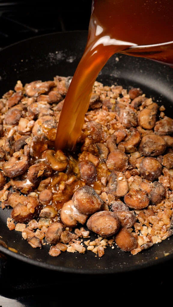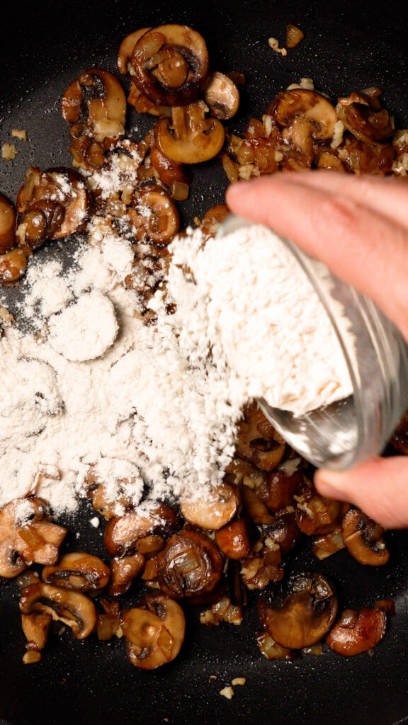 - Add the flour and toss to coat the flour on the mushrooms and onions. Cook for 1 minute and add in the vegan beef or veggie broth and stir.