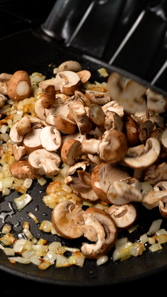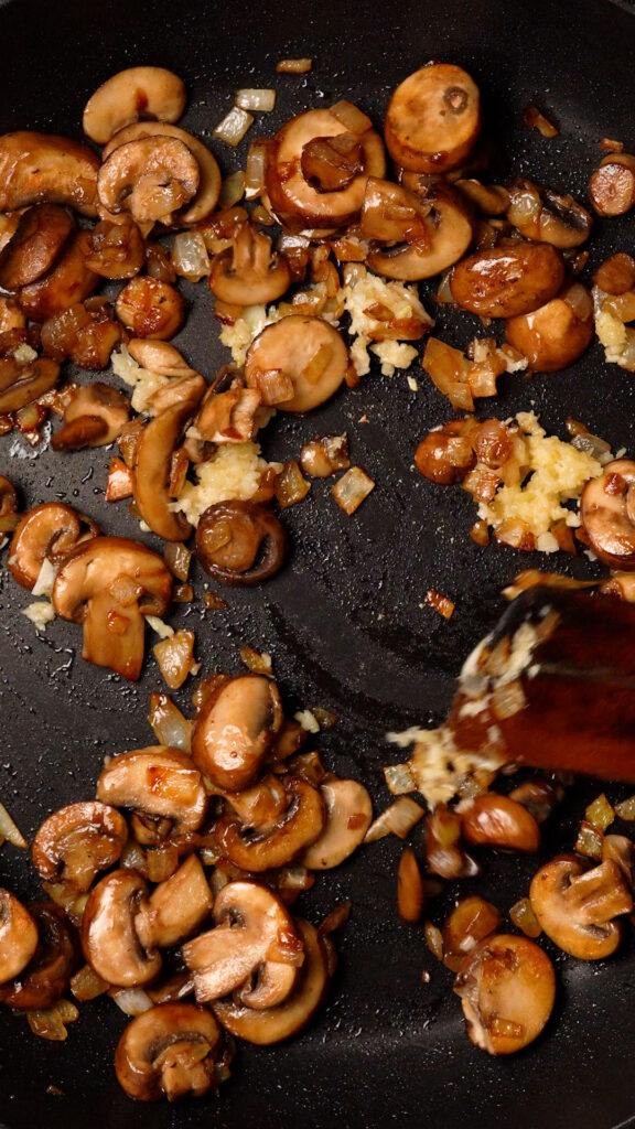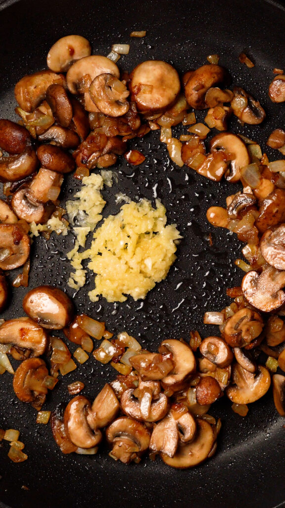 - Add in the mushrooms and cook down for about 6 – 8 minutes or until they've browned. Add in the garlic and cook for one minute.