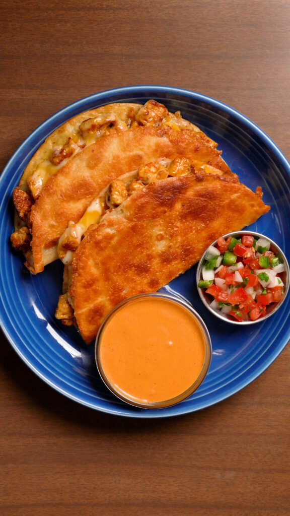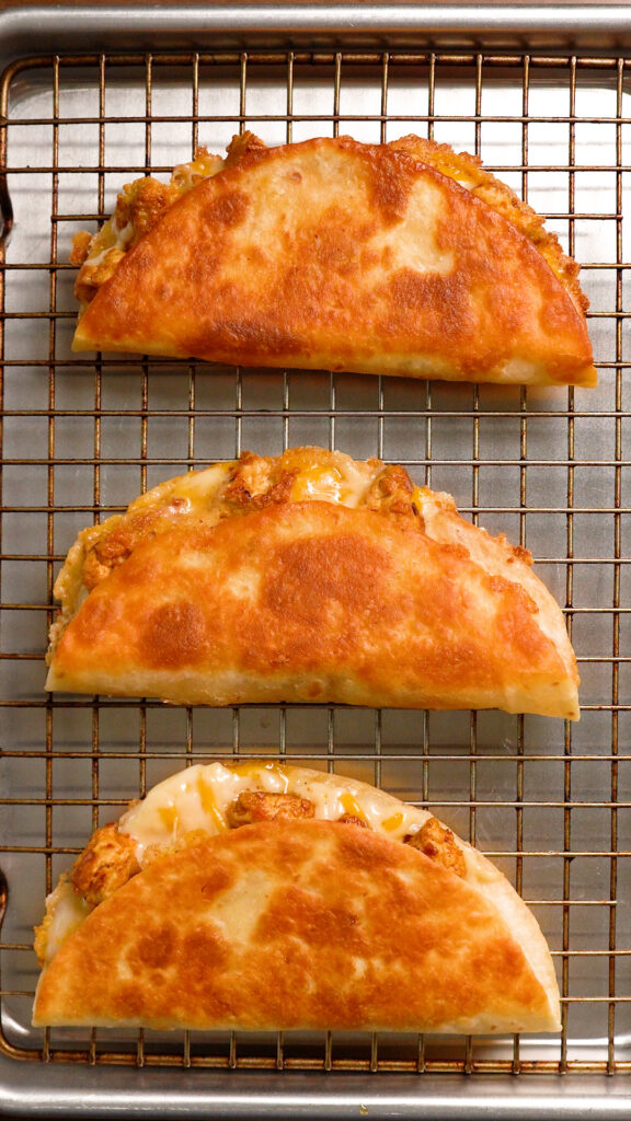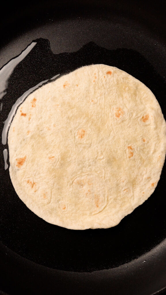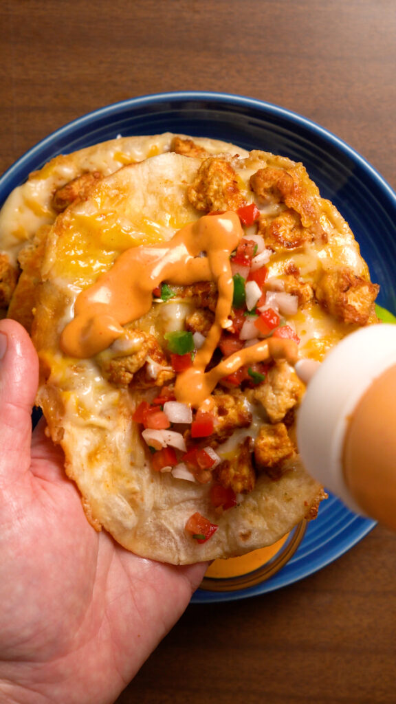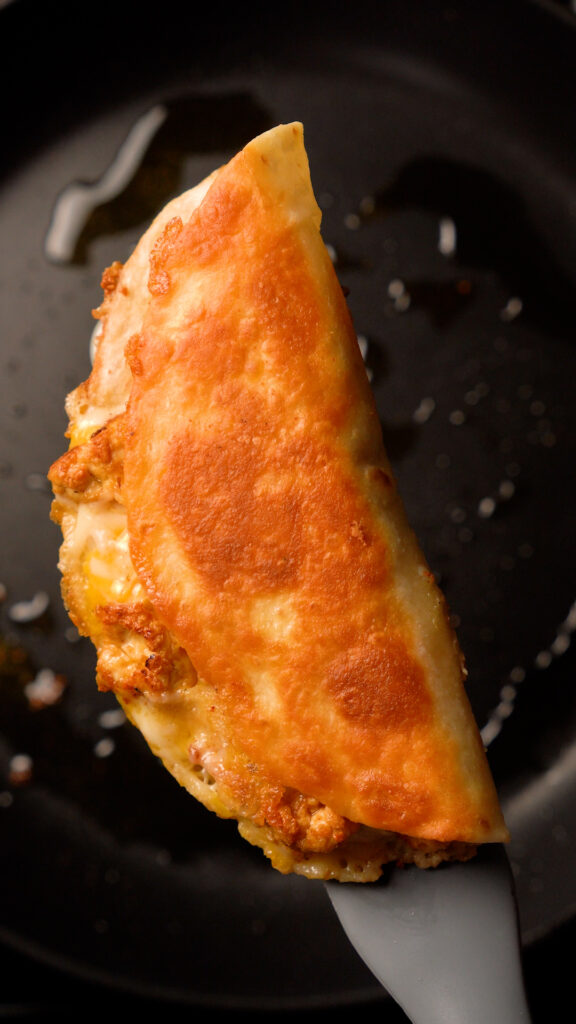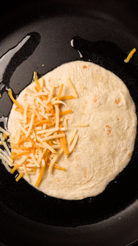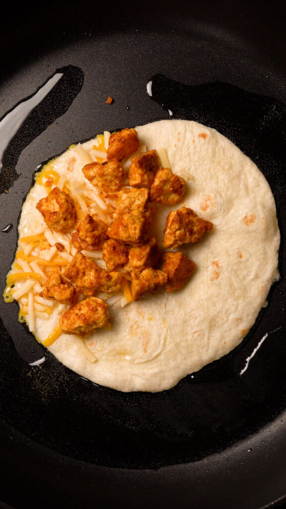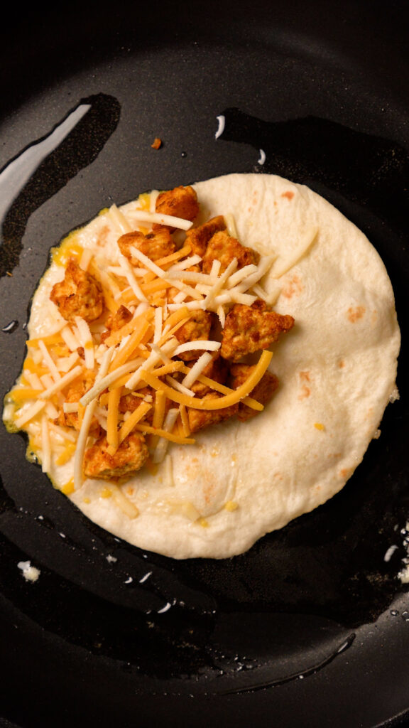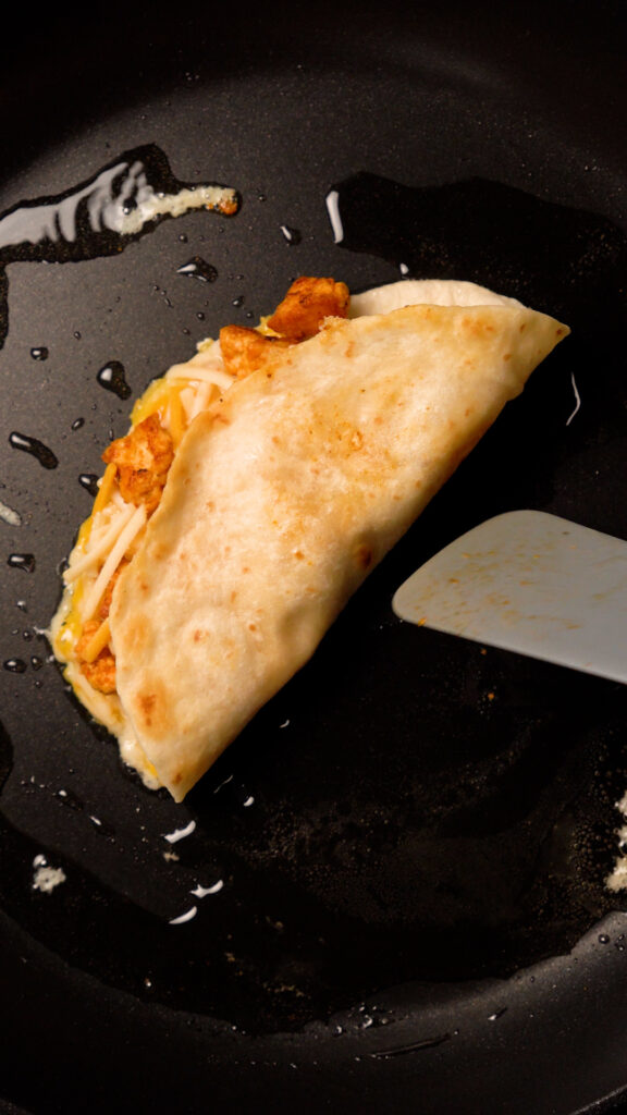 - In a large skillet, add enough oil to the pan to cover a thin layer. Heat up to medium, then add in one tortilla. To one half, add a layer of vegan cheese, then top with some of the tofu, and top with some more vegan cheese. Carefully fold over and press down. Repeat with another tortilla, and if your skillet is big enough, you can do a third. Cook over medium heat until golden brown, about 2 minutes. Flip and repeat on the other side.